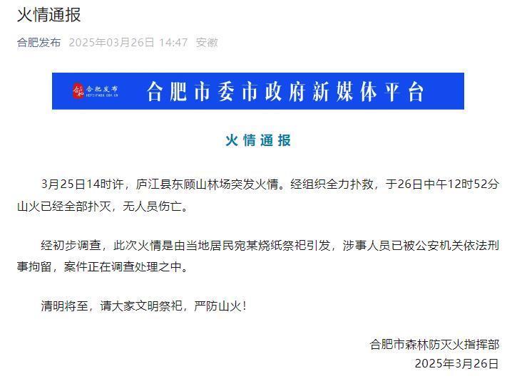此前据央视新闻消息,记者3月26日从庐江县相关部门获悉,25日14时26分,安徽庐江县东顾山林场发生火情。火情发生后,国家消防救援局安徽机动队、合肥市、庐江县均组织救援力量赶到现场处置,现场总救援人数达700余人。经排查,现场无人员伤亡及被困。